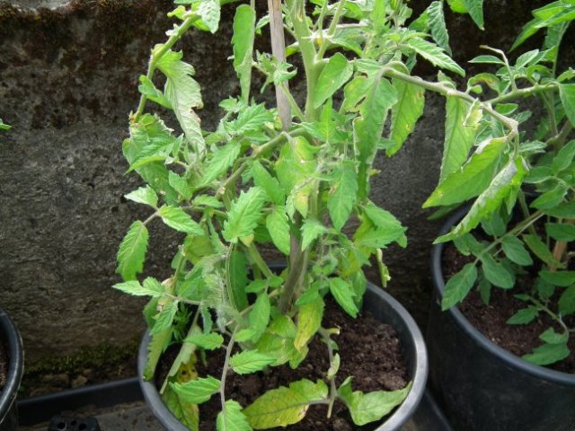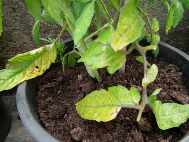 Un manque d'azote dans tes pots de tomates peut-être ?