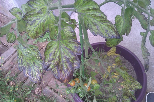 Voilà quelques semaines que notre plan de tomates-cerises est touché par cette maladie: Le plan est en pot, la maladie a l'air de gagner du terrain, mais ne touche pas la tige, ni les fruits.