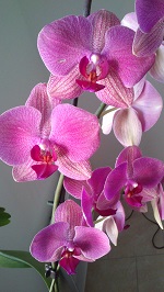 Il me fait quelques fleurs, une ou deux au bout de chaque hampe... il a déjà fait mieux! C'est un phal qui refleurit toujours au bout des hampes existantes. À moment donné, le bout des hampes se met à gonfler, et plusieurs boutons se forment.