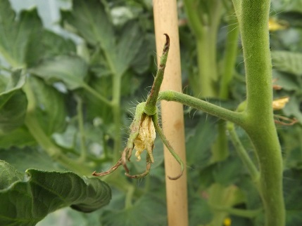 Sur la fleur de la première photo j'ai pu constater la présence de la petite boule verte au centre qui deviendra tomate , je vais surveiller si elle grossit. Une maladie par temps aussi sec est-elle possible? J'avais pensé à un coup de soleil.