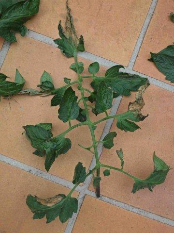 voici des photos de feuilles retirées de mes pieds de tomate, et on dirait bien le mildiou asséché pour le moment à cause des températures extrêmement élevées, mais ne demandant qu'à repartir au moment où les conditions lui seront plus favorables.