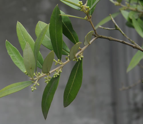 Olivier en pot. Petites olives qui apparaissent.