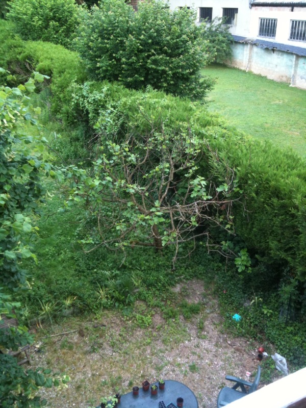 nous sommes ici depuis début 2006, le figuier est mal placé, entre la haie de conifères à droite et un gros tilleul à gauche