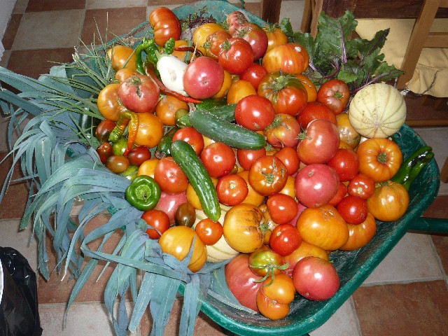 C'est la récolte du jour ... mais on va en donner aux enfants mais aussi aux voisins (sans potager) et qui ne jurent que par les tomates rouges" ... << les tomates vertes, jaunes et oranges, c'est des tomates à "bobos" et c'est dégueulasse >>