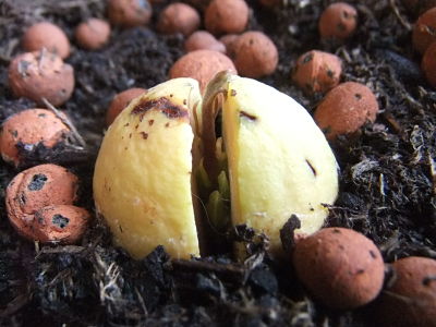 A J13, il commencé déjà à ce fissurer: A J26, une belle racine grandissait, j'ai mis le noyau en terre quand la racine a atteint deux-trois centimètre: A J32, la pousse à enfin pointer le bout de son nez