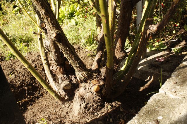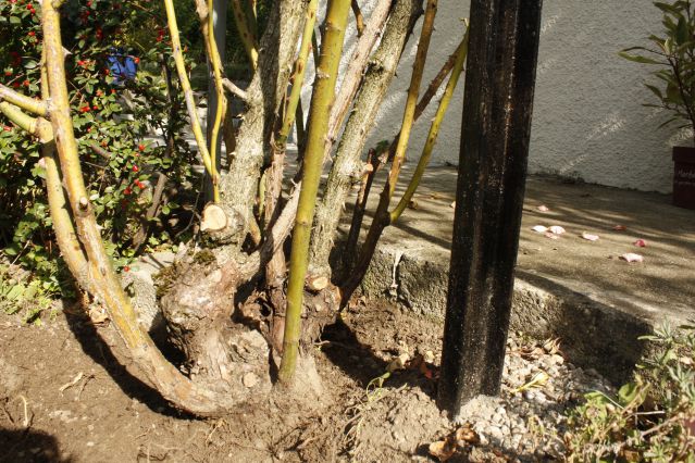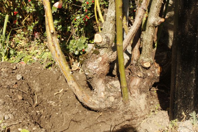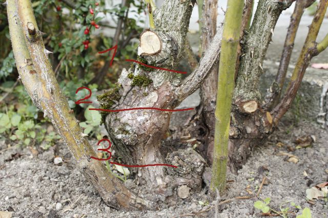 j'ai un soucis et j'ai besoin de vos expériences s.v.p. En prévision de la taille de mon rosier grimpant, au mois de février-mars, on verra, je dois lui enlever une charpentière. Sur l'image j'ai tracé trois lignes, d'instinct je couperai sur la ligne no trois... mais le point de greffe est, pour moi, pas bien défini, je manque beaucoup d'expérience... :pmt: