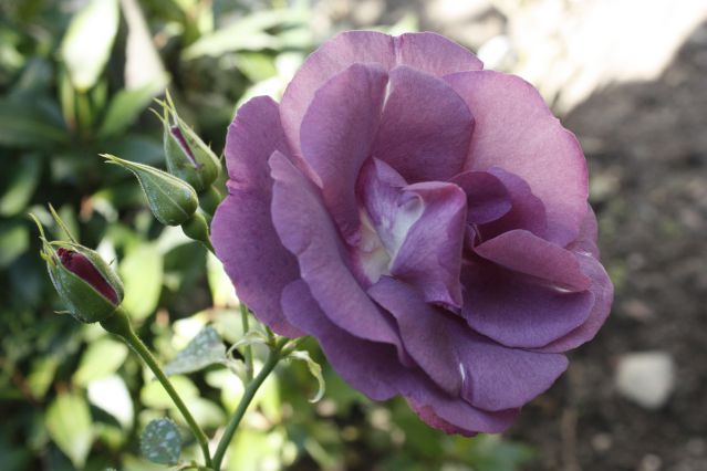 la terre, la terre, mais pas entière noon ! voilà j'ai fait d'autres photos, j'ai dégagé le pied sur plus de 5 cm, je ne m'étais pas rendue compte qu'il était aussi enterré! avec le temps et l'apport de composte... faut-il à l'avenir le laisser comme ça? pour te remercier je t'envoie une photo de la seule rose "rapsody in blue" de cette année!