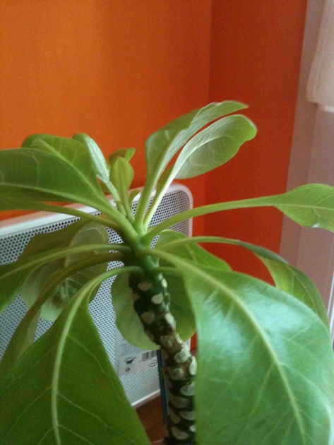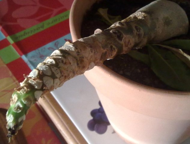 une feuille vient de jaunir, elle reste souple, le caudex est dur, je de petites bêtes, je pense aux stress du voyage......