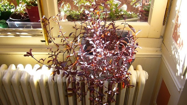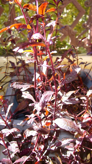 Je rajoute une photo en gros plan pour l'arbuste à feuilles pourpres qui n'est toujours pas identifié. Ses feuilles sont très freles, plutôt allongées. La tige est pourpre aussi. Il est très ramifié. J'ai prélevé la bouture en septembre 2012 dans une jardinière publique là où la plante faisait une belle touffe d'environ 80 cm de haut et un peu retombante.