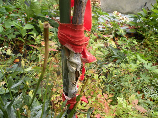 Rien à perdre, le tronc restait encore attaché par un petit lambeau, j'ai remis le tronc en place, je l'ai fixé au tuteur tous les 10 cm, j'ai coupé toutes les fleurs et réduit la masse de feuilles et j'ai appliqué une baume cicatrisante sur la cassure....