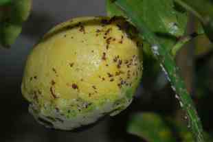 Bonjour, mon citronnier de 3 ans, planté en pleine terre en région PACA, me donne de gros citrons très juteux, mais cette année j'ai constaté des traces blanches sur les feuilles et les branches (comme tous les ans), mais surtout des traces marrons sur les fruits. Voir photos.