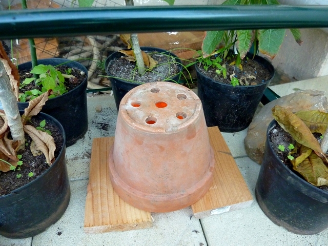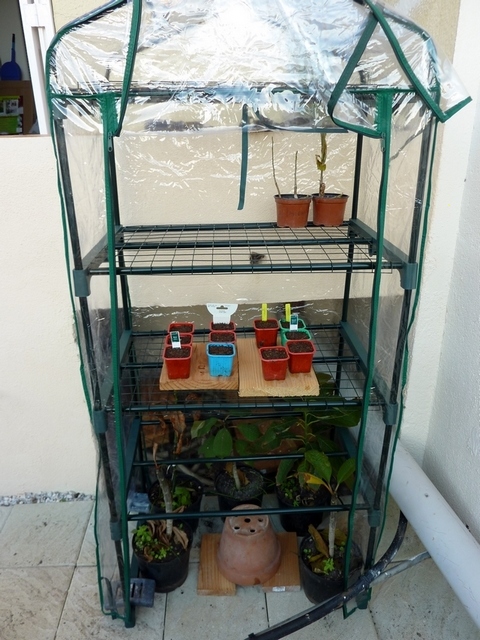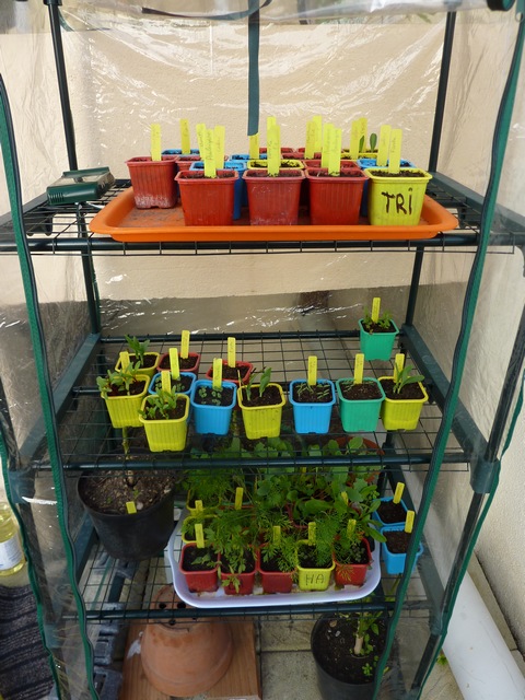 Comme j'ai très peu de place, j'ai une mini-serre étagères. Elle me sert également pour les tropicales peu sensibles.