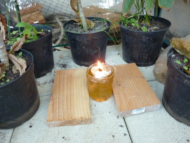 La nuit passée, il a fait 2°C dehors, et dedans c'est descendu à 10°C. Pour le carburant, je récupère les huiles de friture usagées. Le pot de terre cuite retournée protège la lampe et sert également de catalyseur pour la suie. L'autonomie dépasse les 24 h.
