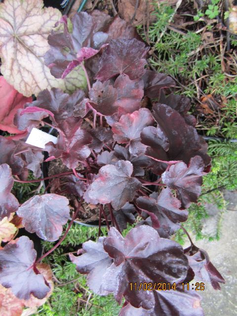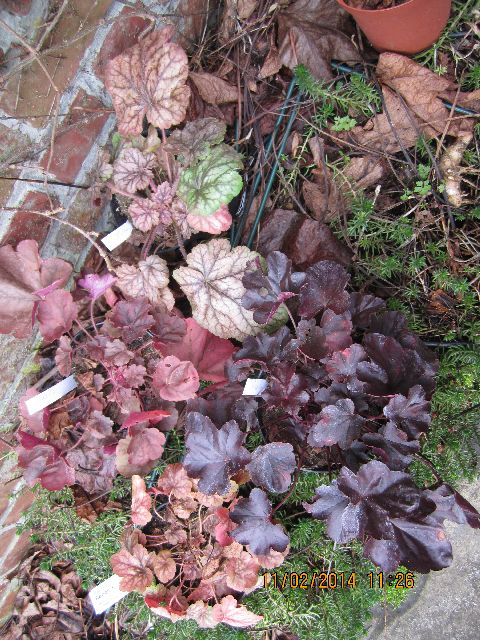 Voici mes dernières arrivées mises à leur place au milieu d'autres heuchères et plantes : Picasso, Renoir, Cassis et Obsidian .