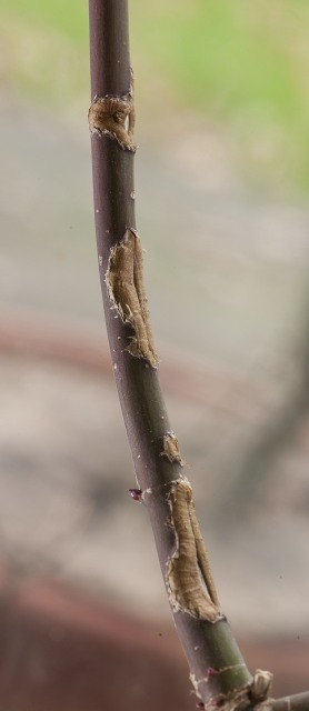 Fentes longitudinales en train de cicatriser, une branche parait rongée par un rat ( les feuilles sèchent) , toute une branche sèche, se décolore, les feuilles pendent. On peut suspecter la verticiliose. Observer le tronc le collet et le départ des racines, si vous voyez une tache foncée... allez voir ailleurs. Les Pépiniéristes connaissent bien cette maladie , les sujets atteints ne sont généralement pas présentés à la vente. Les sujets d'apparence saine peuvent la développer ensuite