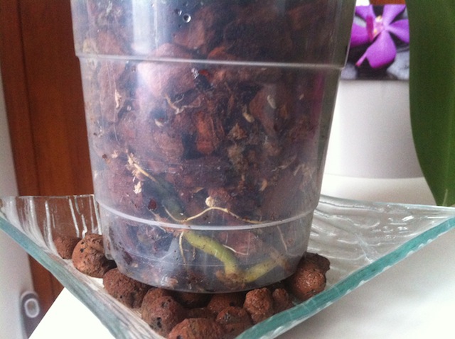 Je laisse tremper pendant 15 minutes et je la remet sur son lit de billes d'argiles, sans cache pot. J'utilisais de l'eau Volvic, mais je ne sais pas pourquoi, j'utilise maintenant l'eau du robinet, c'est peut-être dû à cela ? Comme les racines devenaient jaunes et que rien ne poussait, j'ai arrêté l'engrais.