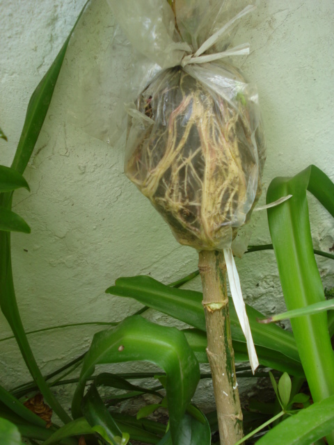 Peu de temps après,j avais procédé au marcottage aérien de la tige vue en pot noir