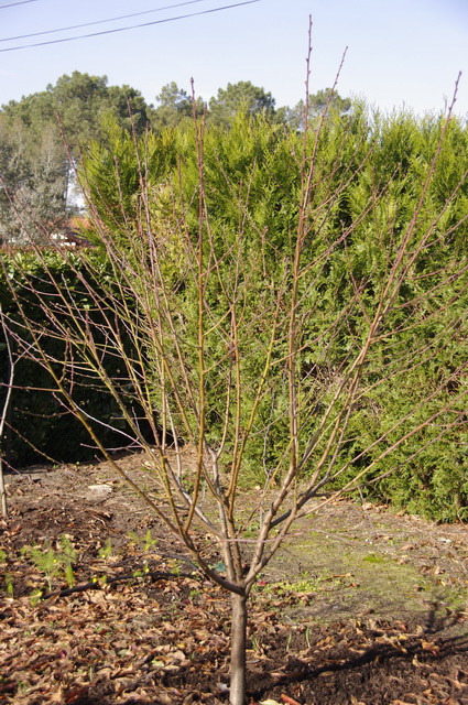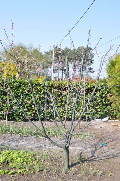 Voilà mon pêcher tailler fin février en tenant compte des conseils de PapiVerger (photo du 14 mars). Je n’ai laissé que des rameaux mixtes. Je vais essayer de le maintenir à cette hauteur, mais comme il est sacrément vigoureux, on verra s’il est d’accord.