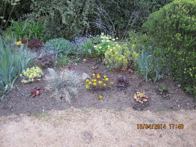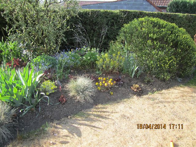 Hello ! voici le résultat du boulot de l'aprem .. j'ai tout chamboulé dans ce massif .. seules les 3 euphorbes sont restées en place ..