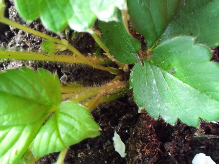 Ma femme et moi avons quelques pieds de fraisiers sur notre balcon depuis l'an dernier. Ce printemps, nous venons de remarquer comme de petits oeufs blancs sur les tiges et les feuilles naissantes des pieds de fraises des bois.