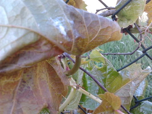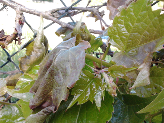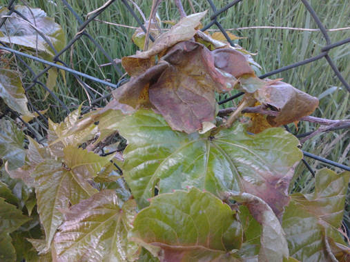 Depuis 2 jours, les feuilles du haut deviennent sombres (rouge marron) un peu comme à l’automne mais ne semblent pas sécher mais sont au contraire devenues toutes molles comme si elles pourrissaient. Et cela sur tous les pieds de vigne.