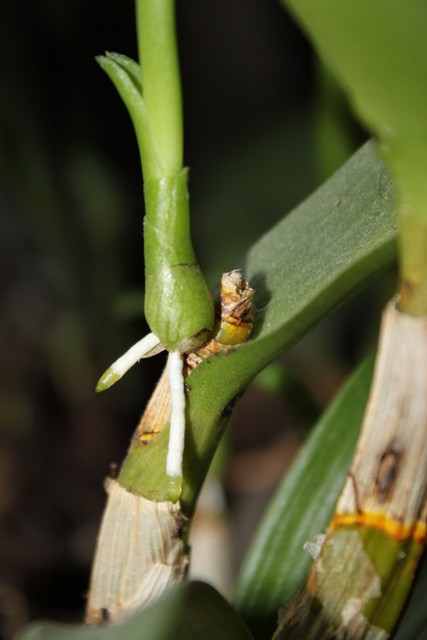 Les keikis du dendro sont euh passé à trépas, pas assez de racines je pense.. peu importe j'en ai qui ont repoussé. J'ai eu peur il y a un mois a peu pres, beaucoup de feuilles ont jaunis, sechées et tombées MAIS j'ai découvert qu'a la base des feuilles tombées des "choses" poussaient! keikis ou enfin des hampes? je n'en sais rien, je verrais bien, en attendant qu'elle fleurisse elle me fait au moins des feuilles