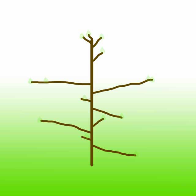 Il existe plein de formes de pommier, tout dépend la forme que tu veux lui donner (haute tige si tu veux qu'il soit haut ...mais attention à la hauteur des fruits quand tu voudras les cueillir..), ou basse tige, palissé, etc... tu trouveras facilement sur le Net divers schémas qui t'inspireront sûrement.