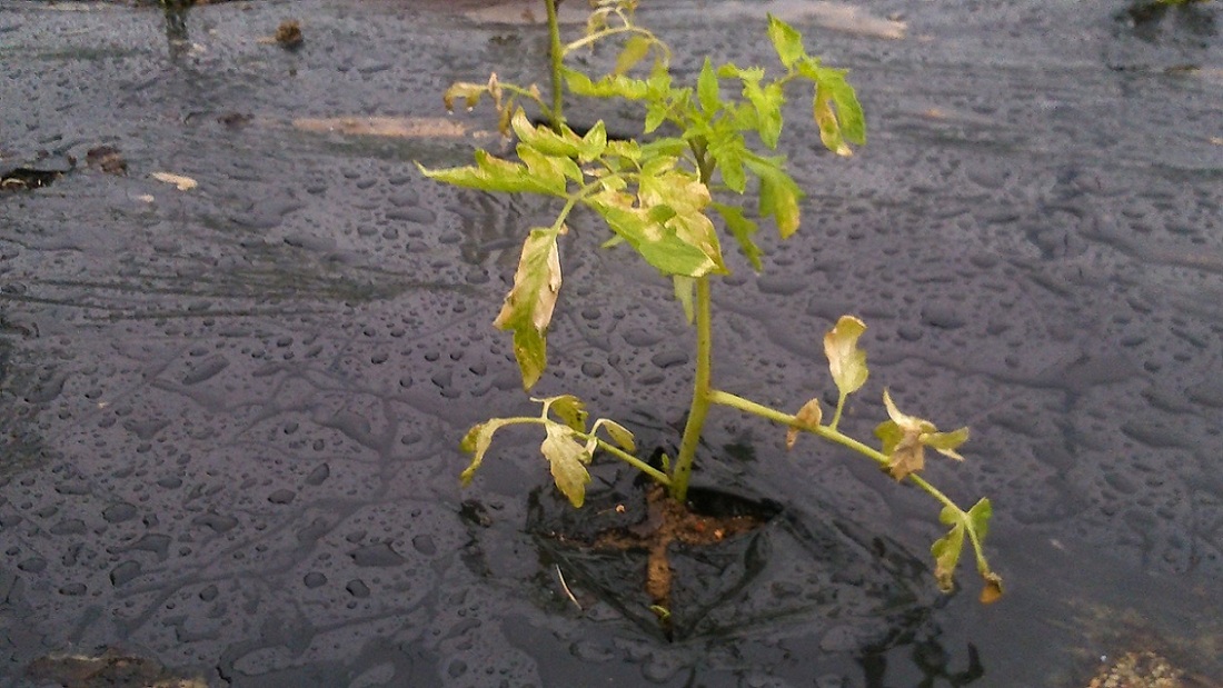 Bonjour la bache noire que tu a mis dessous ne garderai pas trop l'eau?Apparement il pleut chez toi en ce moment.Les mienne avaient un peu jaunies au repiquage car j'ai eu 4 jours de pluie juste après.Maintenant elle vont beaucoup mieux.Je n'ai jamais cultivé la tomate sur toile alors je ne sais pas trop quoi te conseiller.