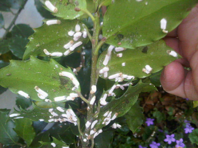 Je découvre ce site et vous sollicite pour un avis sur cette forme de cochenille qui envahit mon pied de houx. Voir photo. L'an passé j'ai fait une taille un peu sévère mais la bestiole est toujours là !