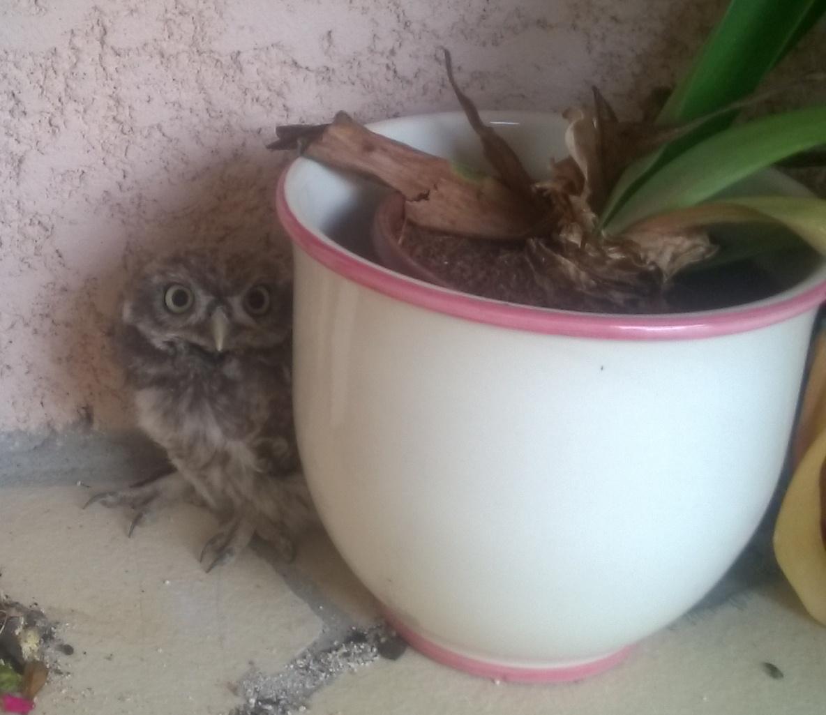 Voici une chouette qui se trouve sur ma terrasse la journée (derrière un volet).