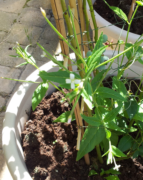 Les photos sont de mauvaise qualité, désolée, comme elle est toute fine, j'ai du mal à bien la prendre. Toujours en est-il qu'après un début assez passif, elle commence à grandir et à prendre de la place. Elle a de toutes petites fleurs blanches (quatre pétales) qui poussent au bout d'une longue tige sans feuille. Les feuilles sont plus bas et paraissent très légèrement dentées ?