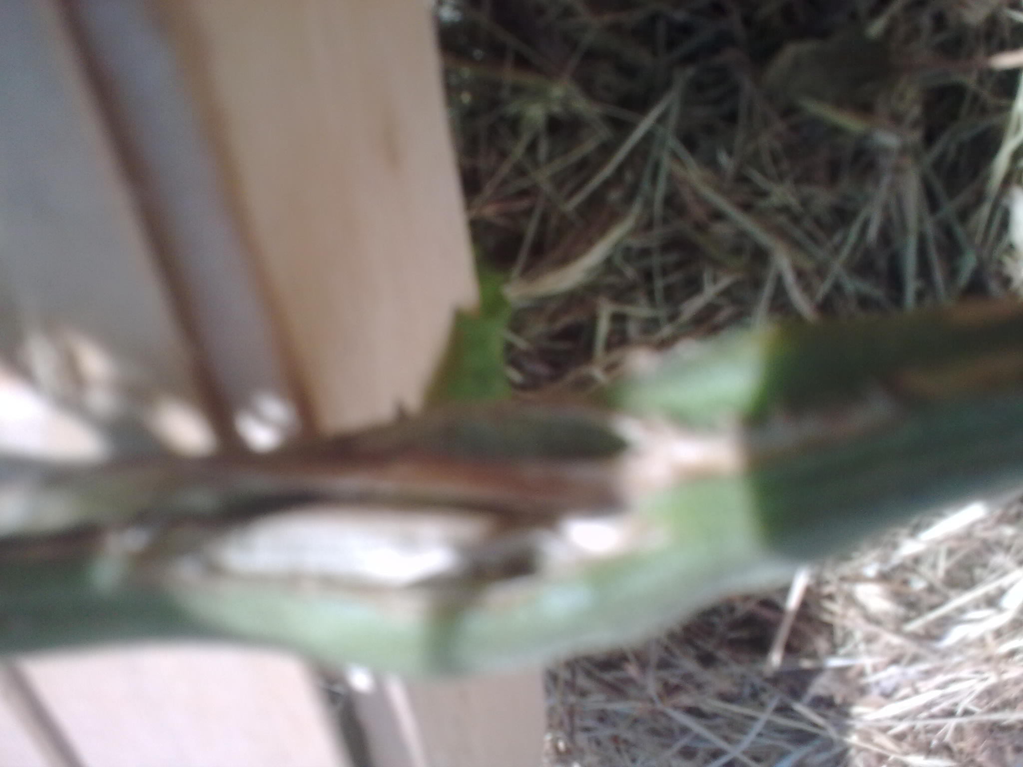 Je viens de voir que la tige d'un de mes plants de tomates s'était fendue. Désolée pour la photo de mauvaise qualité mais j'espère que cela permettra de vous faire une petite idée.