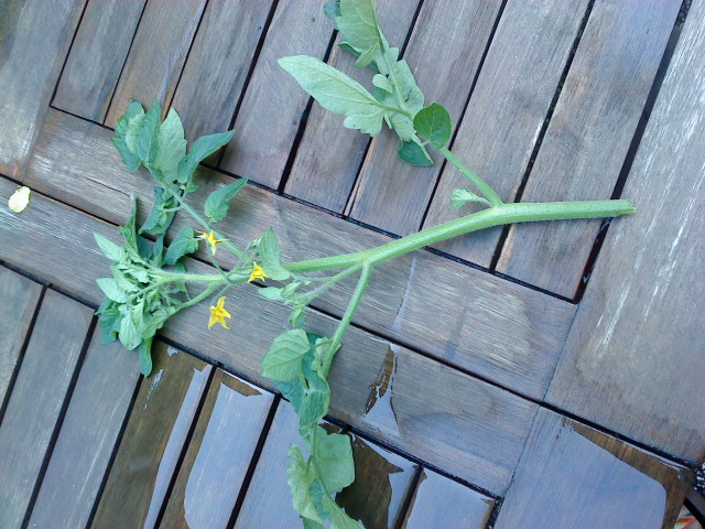 Pour la partie récupérée, tu le mets dans un verre d'eau le temps que les racines apparaissent et zou en PT pour un nouveau plant de tomate. Je supprimerais les fleurs.