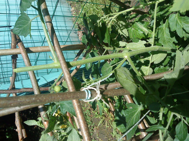 En ce moment, avec l'alternance pluie/chaleur, mes plants de tomates ont fait des poussées fulgurantes. Un plant notamment a pris 20 bons cm en à peine quelques jours. Ca et la grêle d'hier ont commencé à le faire pencher dangereusement et en voulant le tuteurer ce matin, ce qui devait arriver arriva, je l'ai cassé