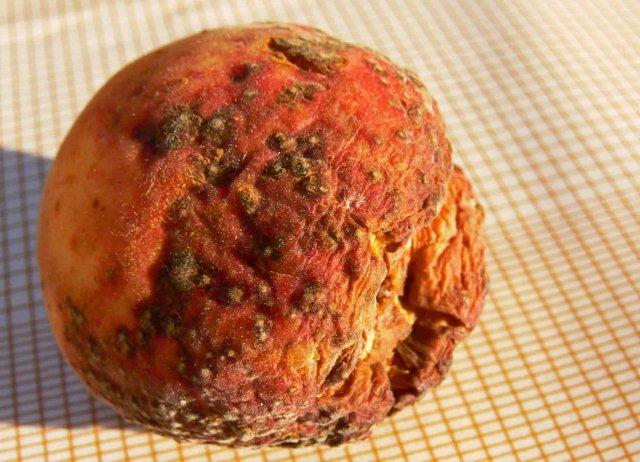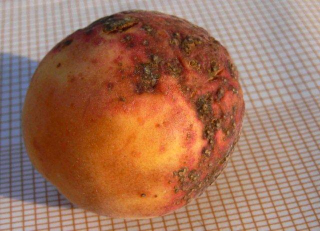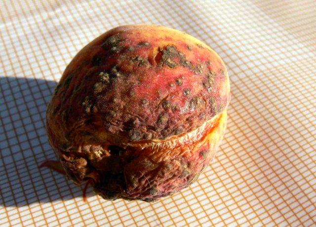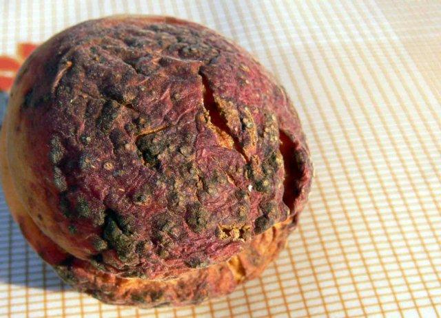 la pulpe à l'intérieur est bonne, mais il faut éplucher le fruit sur la moitié car curieusement seul un côté du fruit est atteint.