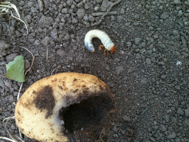 Mauvaise surprise aujourd'hui au moment où j'arrache de magnifiques charlottes (pommes de terre primeures). J'en ai trouvé un certain nombre fusillées par d'horribles vers blancs. Sur un sillon de 6 mètres j'ai dû en trouver 10.