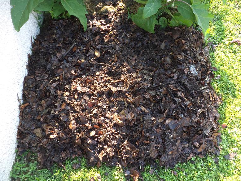 J'ai légèrement agrandi mon nouveau potager pour ça il m'a suffit d’étaler sur la pelouse des feuilles mortes que je gardait à l’abri depuis l'automne dernier.