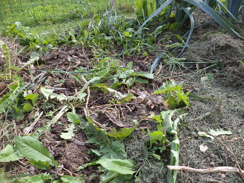 La place étant libérée et pleine d'herbes j'y est donc déposer une grosse couche de tontes de gazon(environ 20 cm) qui va permettre d'étouffer et brûler les herbes.