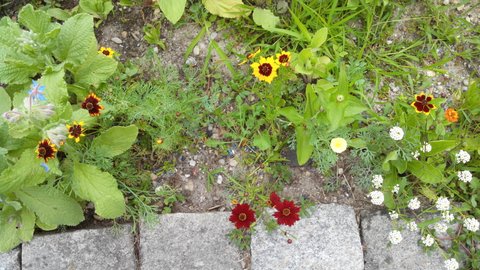 J'ai un massif de fleurs mélangées,où je ne connais pas certaines espèces, entre autres, ces jolies fleurs jaunes et rouges. Qui saurait me dire le nom ? Seules les couleurs pourraient faire penser à des tagètes, mais la ressemblance s'arrête là.