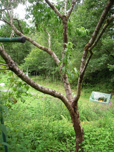 J'ai aussi commencé à tailler le grand Cerisier, qui est quelques mètres devant le Pêcher, qui présente les mêmes symptômes: gomme sur le tronc mais aussi sur de jeunes bourgeons, et feuilles tachées, bourgeons qui noircissent et meurent.