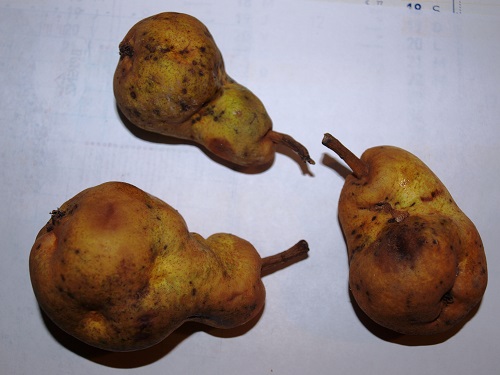 Les poires sont déformées et sous la déformation, il y a des masses constituées de gros grains durs. Les petites poires sont irrécupérables et bonnes à jeter.