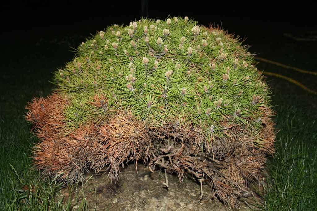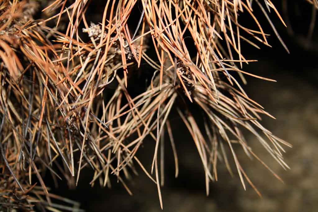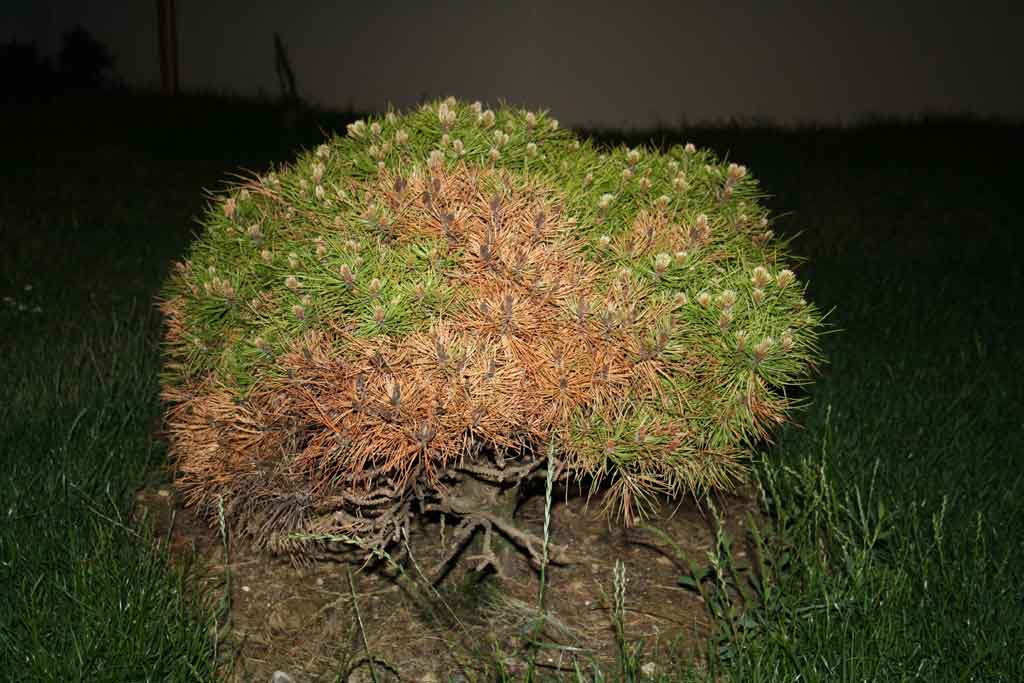 Le responsable de la pépinière examine le pin en détail et finit par 'diagnostiquer' une attaque par l'araignée rouge, matérialisée par des petites traces blanches sur les bourgeons, par ailleurs très difficile à voir à l'oeil nu.