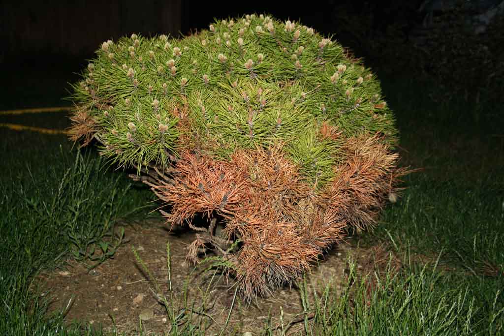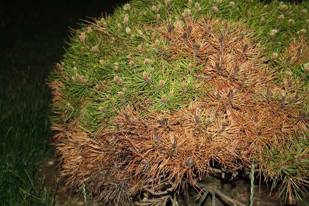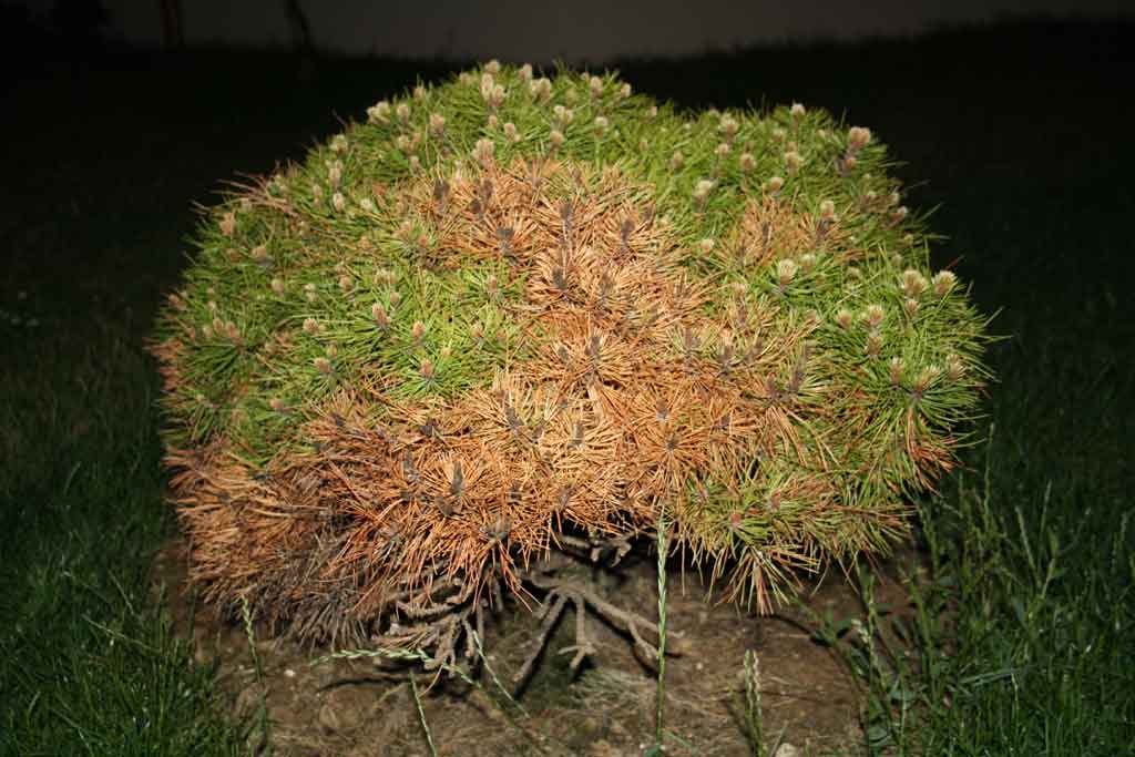 Le responsable de la pépinière examine le pin en détail et finit par 'diagnostiquer' une attaque par l'araignée rouge, matérialisée par des petites traces blanches sur les bourgeons, par ailleurs très difficile à voir à l'oeil nu.