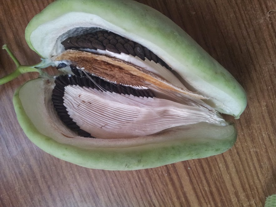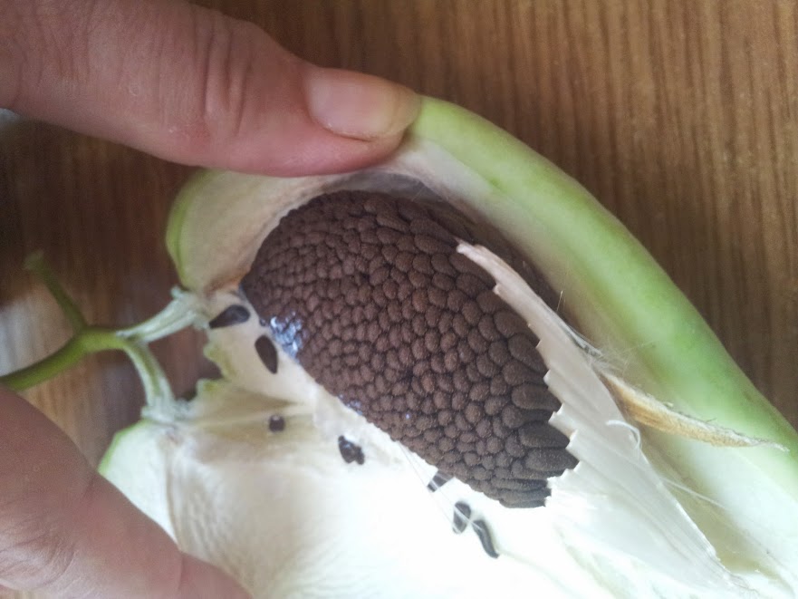 Le fruit ressemble a une sorte de poivron et lorsque j'ai ouvert l'enveloppe, un peu de lait en est sorti. les graines sont brunes et bien rangées, elles sont disposées sur du foin (comme dans les artichauts) bien blanc et brillant.