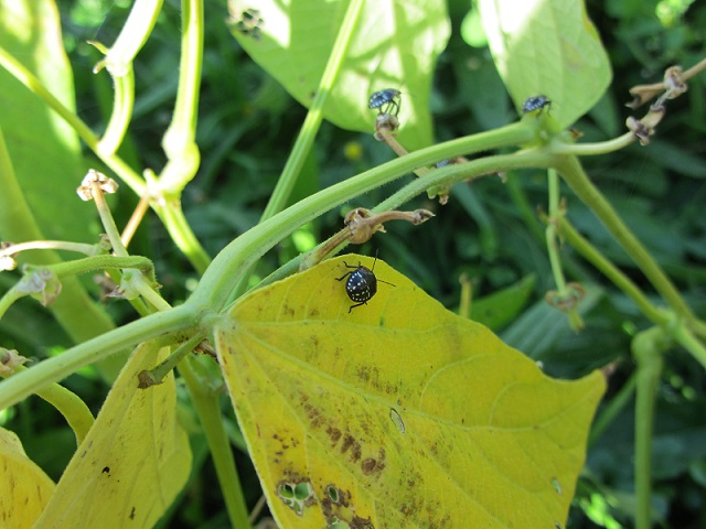 Cette bestiole a commencé à envahir mes tomates cerises. Les tomates étant passées à la poubelle pour cause de mildiou, les bestioles n'ont pas baissé pavillon mais ont pris position sur les haricots situés à proximité, plus précisément sur deux pieds dans une rangée.