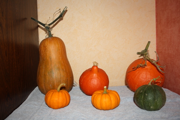 La récolte des courges de garde a commencé : deux grosses Sucrine du Berry (il en reste à cueillir), quelques potimarrons (il en reste aussi à cueillir) et toutes les "Pommes d'or".