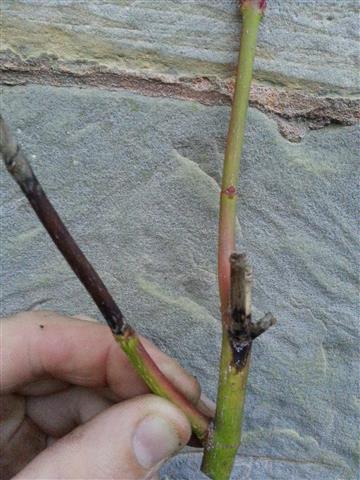 -Le noircissement des branches quand il a lieu en été et en automne indique un problème de racines. La chaleur du substrat (pot au soleil) et son humidité excessive accélèrent le développement de la maladie qui souvent est un Phytophthota.