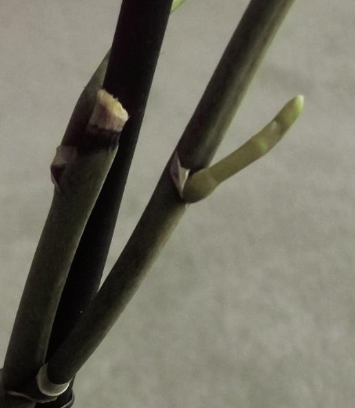 En attendant, le début de hampe juste au dessus d'une racine se confirme! Et voici celle-qui pousse sur une des anciennes hampes défleuries (qui avait elle aussi poussé à partir d'une ancienne hampe, ça fait pas mal de ramifications