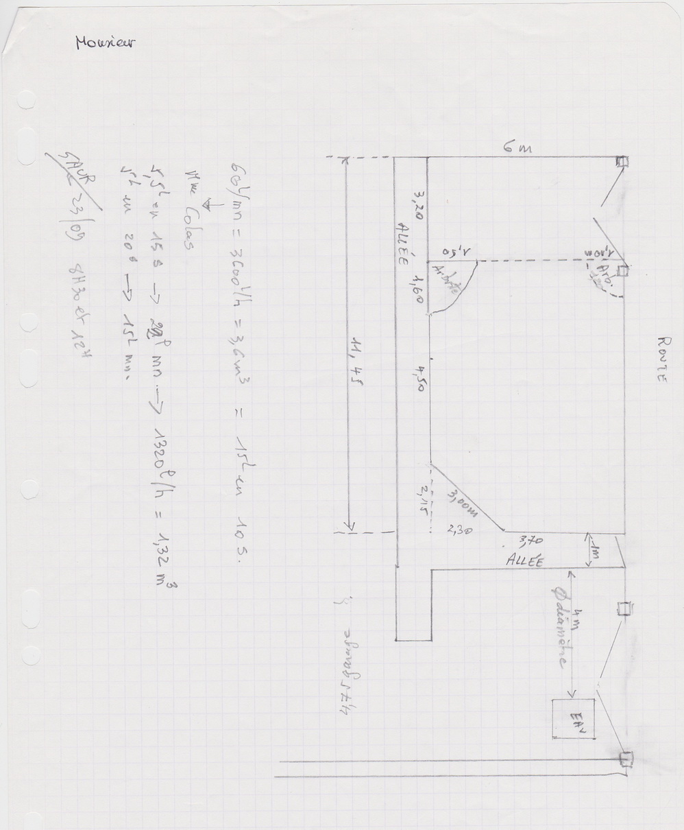 * je n'ai pas compris votre débit disponible. Il y a plusieurs annotations contradictoires sur votre plan. Faire le test du seau de 10 litres est une bonne indication. Sachez qu'au dessus de 21 secondes pour 10 litres, on peut supposer une pression faible, voir très faible, et qu'il devient un peu risqué de réaliser une installation d'arrosage enterré ayant des besoins plus élevés en pression.