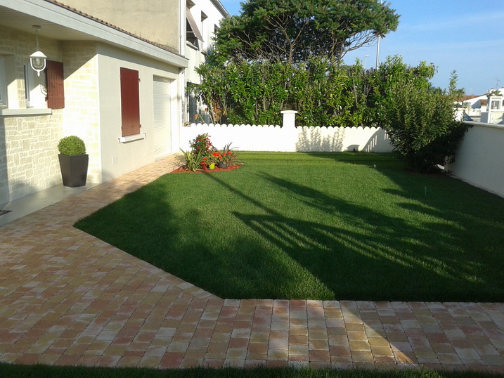 - L'arrosage est prévu jusqu'au muret du fond. L'arbre à droite est taillé à 1 m de haut et à gauche c'est plus bas. La surface totale est inférieure à 70m2 (11,45x6)